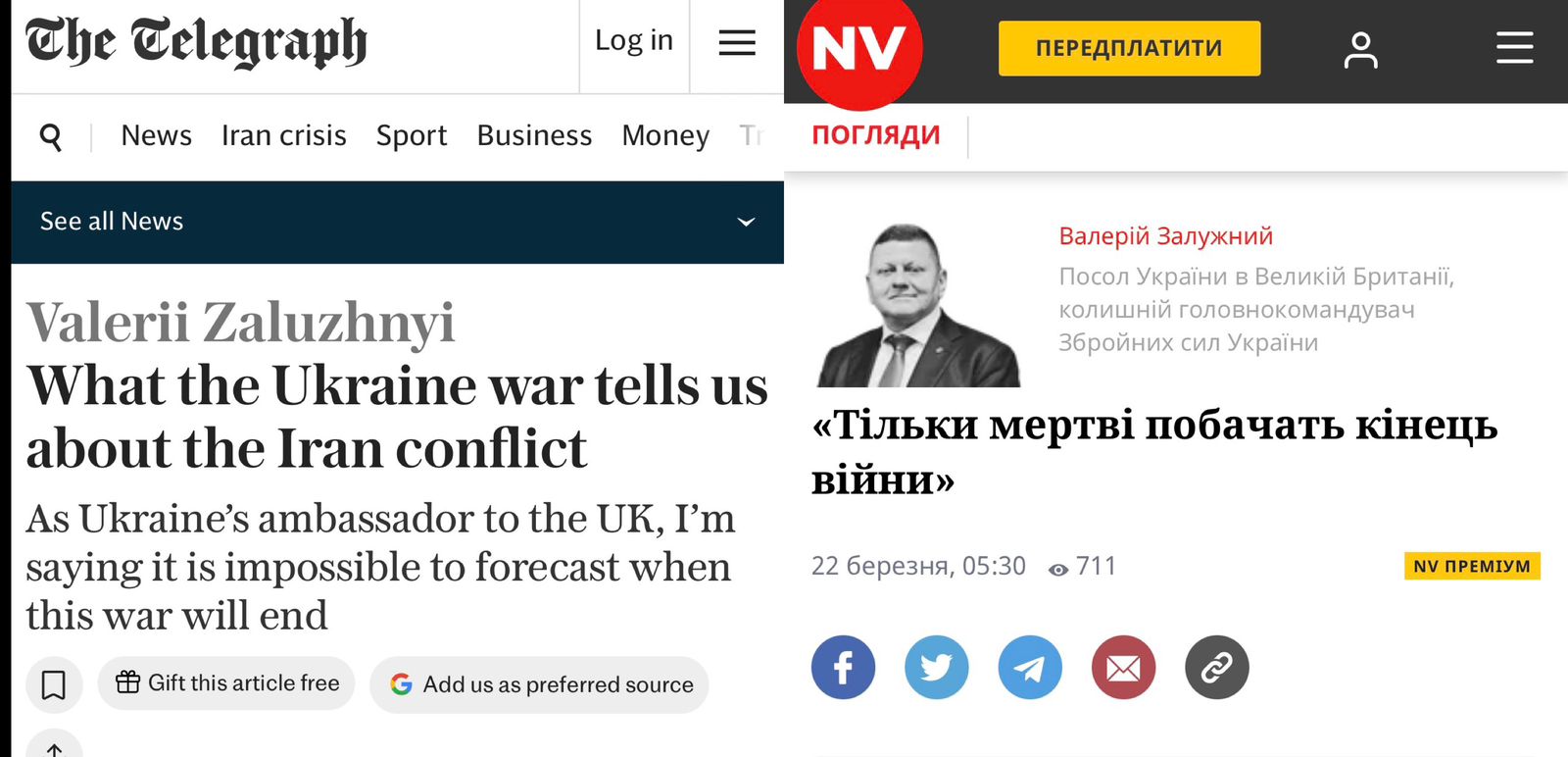 Залужний у своїх роздумах чи не єдиний із західних військових відверто застерігає від проведення наземної операції в Ірані (фактично попереджає Трампа та Ізраїль) – ви отримаєте «kill-zone», як в Україні. І дійсно, дрони здатні зруйнувати будь-які плани застосування сухопутних військ в їх класичному вигляді.